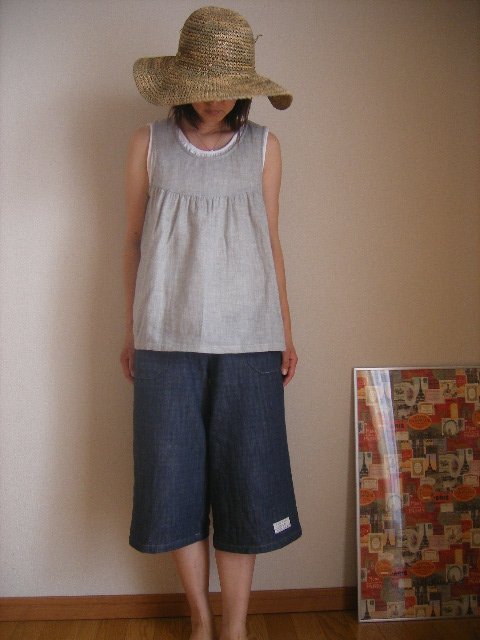 ギンガムブラウスとの相性は抜群! 夏の装い。トップスは1L-08 ↑バックスタイル