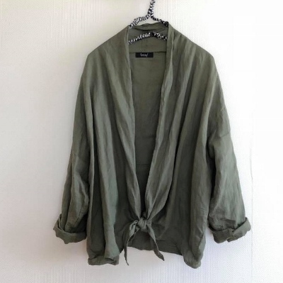 | 【季節の変わり目や温度調節に便利な羽織りもの】 肩は少しドロップしたゆったり目のシルエットです。 身頃続きの衿はきちんと形を付けずに ショールのようにクシュっとさせて着用します。 少し肩線を後に抜いて着用すると格好よく見えます。 サンプルは長袖を2折りくらいロールアップしています。