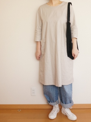 わずかにAラインですが全体的にストンとシンプルなシルエット 肩も少しドロップしていて、ゆったり目のサイズ感です。