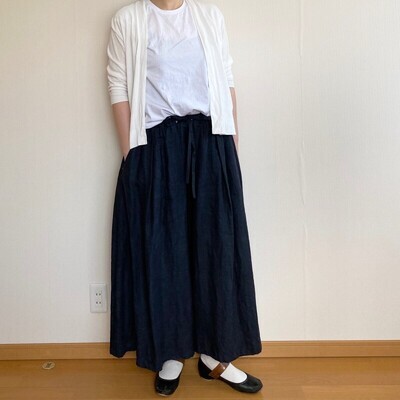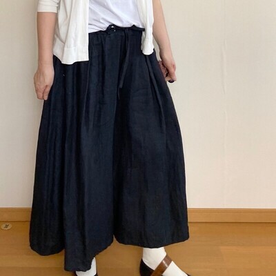 裾に向かってAラインに広がるボリューム多めのキュロットパンツ。 フロントのみタックが入ります。くるぶしまでのロング丈です。 | |