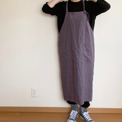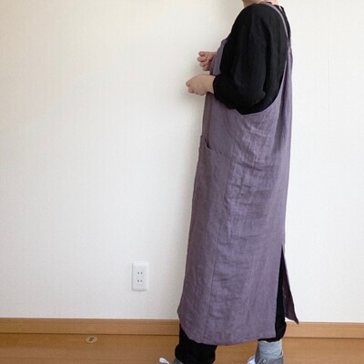 タイトラインの大人のエプロンワンピです。 タイトといってもウエストのゆとりは十分あり、緩めのサイズ感になっています。 あくまでもエプロンなのでお洋服の上から着用してください。