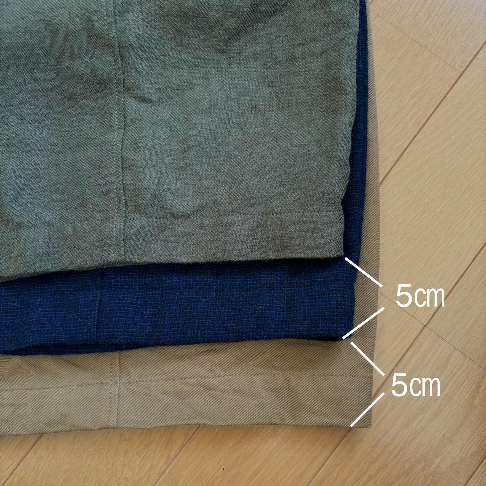 | 【サイズ選びのポイント】 長さは適応身長に合わせてください。 長さで迷った場合はお手持ちのパンツと比較すると 丈の微調整は、2〜3cm程度なら裾線で平行に |