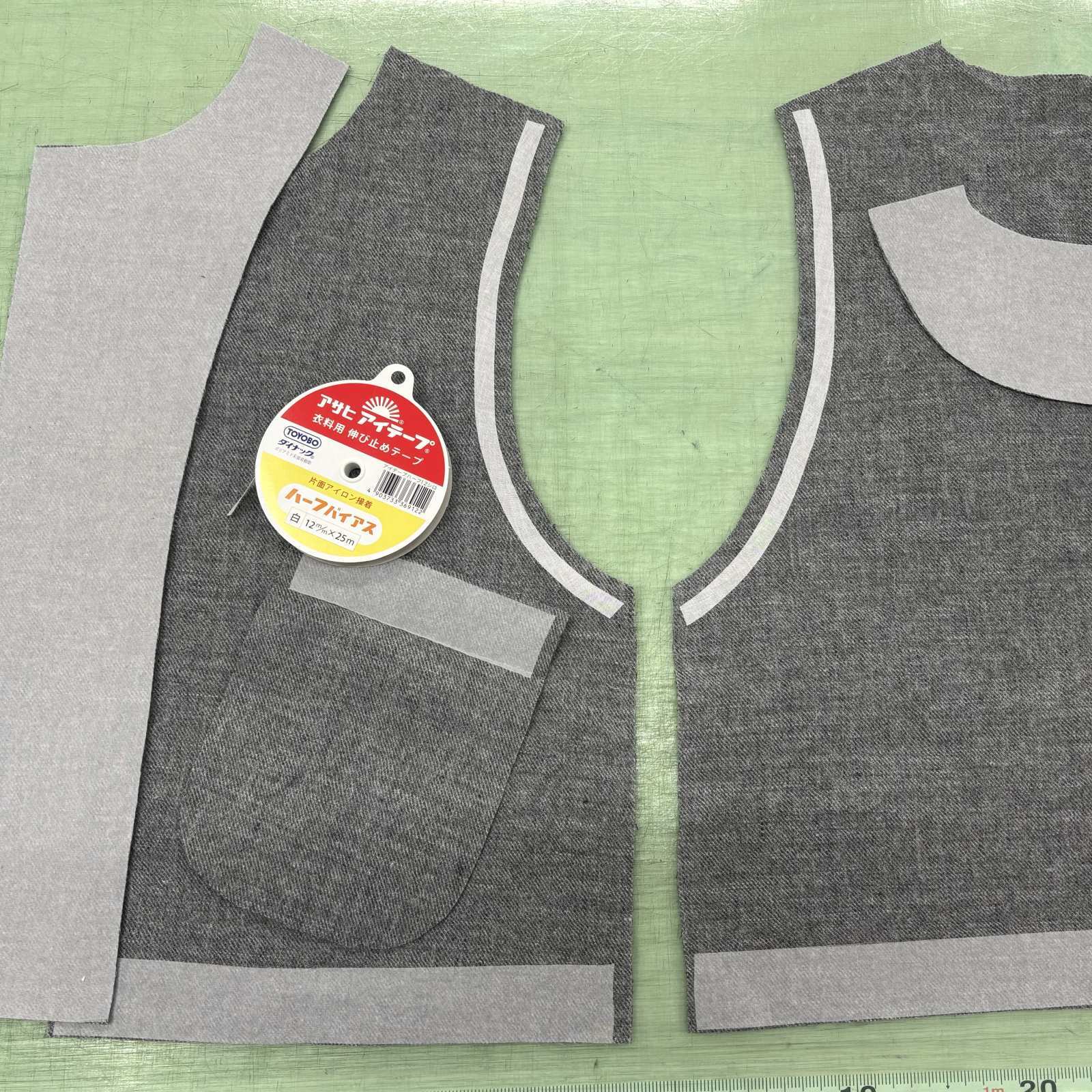 袖ぐりに伸び止めテープ(バイアス)を貼ってください